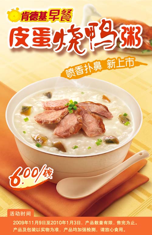 肯德基新皮蛋烧鸭粥喷香扑鼻新上市,6元/碗,2009年11月9日至2010年1月3日产品数量有限,售完为止。