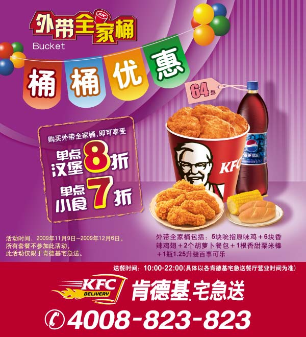 肯德基宅急送全家桶(64元)享受汉堡八折小食七折优惠