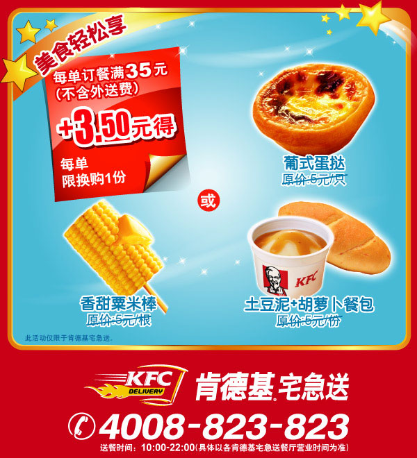 每单订餐满35元(不含外送费),+3.5元得葡式蛋挞1只,或香甜粟米棒1根,或土豆泥+胡萝卜餐包1份。每单限购1份。