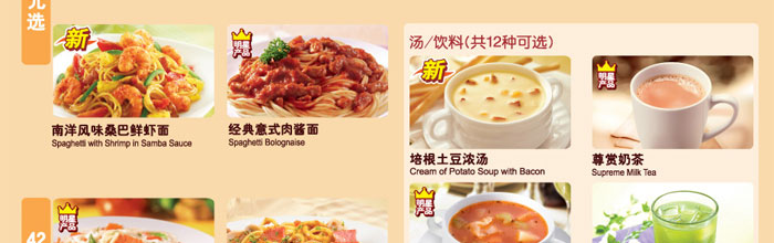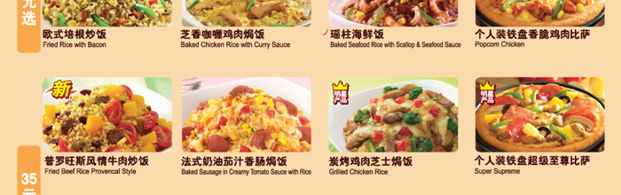 普罗旺斯风情牛肉炒饭,法式奶油茄汁香肠焗饭,炭烤鸡肉芝士焗饭,个人装铁盘超级至尊比萨,南洋风味桑巴鲜虾面,经典意式肉酱面。