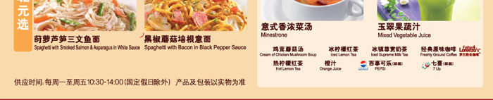 培根土豆浓汤,尊赏奶茶,意式香浓菜汤,玉翠果蔬汁,鸡茸蘑菇汤,冰柠檬红茶,冰镇尊赏奶茶,经典原味咖啡,热柠檬红茶,橙汁,百事可乐,七喜。
